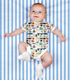 Each bodysuit is made of organic cotton and feature a reinforced snap crotch and a repeat print on the front, back and sleeves. Machine wash cold. Tumble dry light. The pattern placement will vary depending upon the size.