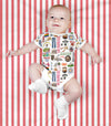 Our baby bodysuits come in 5 sizes and are a clever little homage to some of our favorite locales. Each features iconic original images, and is gift wrapped in a cellophane bag. They are made-to-order; the general lead time is approximately 2 weeks-3 weeks.