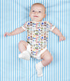 Each bodysuit is made of organic cotton and feature a reinforced snap crotch and a repeat print on the front, back and sleeves. Machine wash cold. Tumble dry light. The pattern placement will vary depending upon the size.