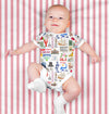 Our baby bodysuits come in 5 sizes and are a clever little homage to some of our favorite locales. Each features iconic original images, and is gift wrapped in a cellophane bag. They are made-to-order; the general lead time is approximately 2 weeks-3 weeks.
