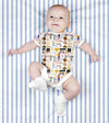 Each bodysuit is made of organic cotton and feature a reinforced snap crotch and a repeat print on the front, back and sleeves. Machine wash cold. Tumble dry light. The pattern placement will vary depending upon the size.