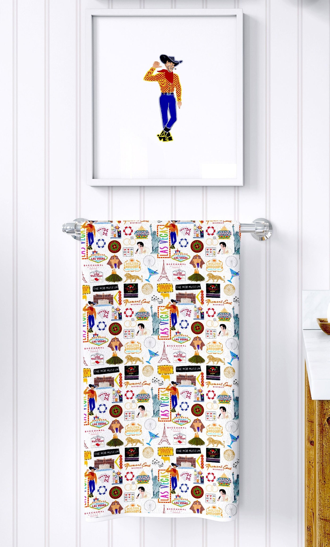 Our towels feature original watercolor art of iconic locales. We offer two sizes to fit your bathroom needs. Hand towels measure 16" x 28" and our bath towels measures a generous 30"x60". The printed side provides a vibrant print, while the reverse cotton side provides for softness and absorbency.
