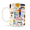 Mugs measure 5" tall and hold 15 oz. of hot liquids. Both dishwasher and microwave safe.