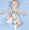 Each bodysuit is made of organic cotton and feature a reinforced snap crotch and a repeat print on the front, back and sleeves. Machine wash cold. Tumble dry light. The pattern placement will vary depending upon the size.