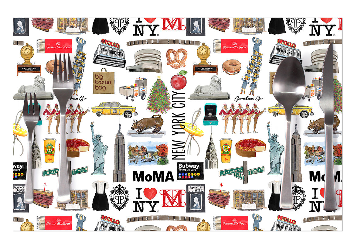 Original watercolors of iconic locales are featured on our pad of disposable placemats. Each placemat measures 17"x11" and comes in a pad of 24 on #60 paper.