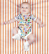 Each bodysuit is made of organic cotton and feature a reinforced snap crotch and a repeat print on the front, back and sleeves. Machine wash cold. Tumble dry light. The pattern placement will vary depending upon the size.