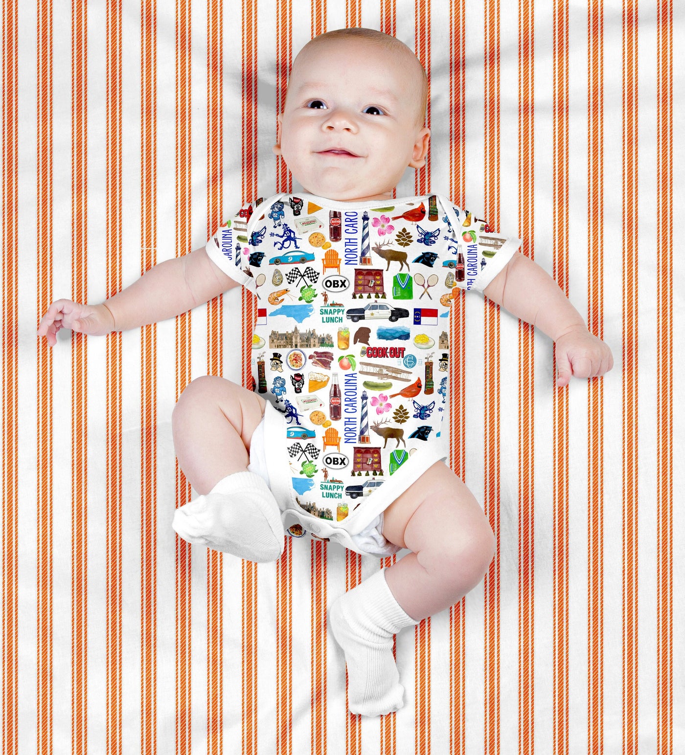 Our baby bodysuits come in 5 sizes and are a clever little homage to some of our favorite locales. Each onesie features iconic original images, and is gift wrapped in a takeout food container. They are made-to-order; the general lead time is approximately 2 weeks-3 weeks.