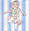 Each bodysuit is made of organic cotton and feature a reinforced snap crotch and a repeat print on the front, back and sleeves. Machine wash cold. Tumble dry light. The pattern placement will vary depending upon the size.