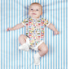 Each bodysuit is made of organic cotton and feature a reinforced snap crotch and a repeat print on the front, back and sleeves. Machine wash cold. Tumble dry light. The pattern placement will vary depending upon the size.