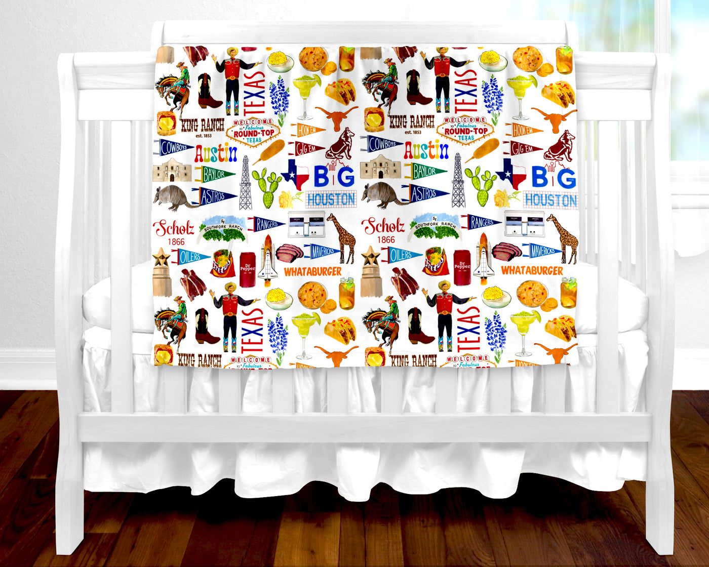 Our iconic geography baby blankets measure 30" x 40" and are made of super soft fleece. They're always a favorite at baby showers.