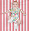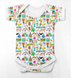 Each bodysuit is made of organic cotton and feature a reinforced snap crotch and a repeat print on the front, back and sleeves. Machine wash cold. Tumble dry light. The pattern placement will vary depending upon the size.