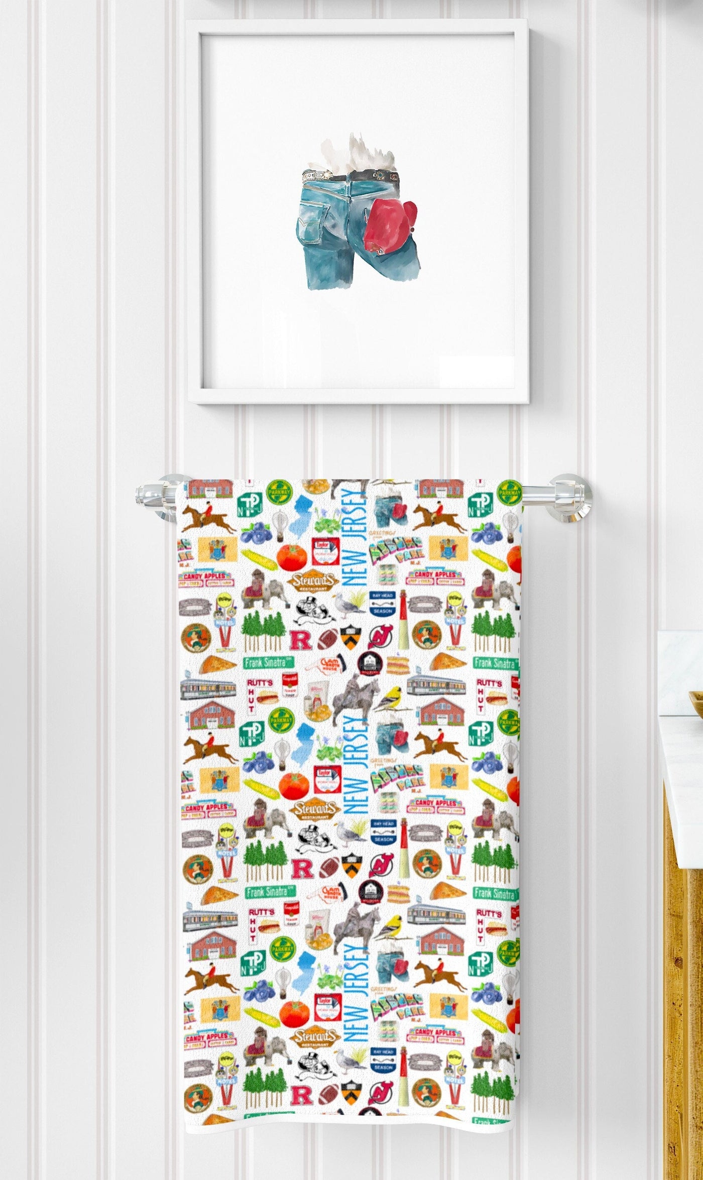 Our towels feature original watercolor art of iconic locales. We offer two sizes to fit your bathroom needs. Hand towels measure 16" x 28" and our bath towels measures a generous 30"x60". The printed side provides a vibrant print, while the reverse cotton side provides for softness and absorbency.