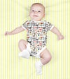 Each bodysuit is made of organic cotton and feature a reinforced snap crotch and a repeat print on the front, back and sleeves. Machine wash cold. Tumble dry light. The pattern placement will vary depending upon the size.