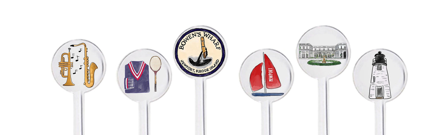 Six iconic Newport, Rhode Island watercolor images are features on our set of 12 reusable swizzle sticks. Each clear plastic swizzle stick measures 7" long. The circle portion with the image is 1.25" round. The image is printed directly onto the stick. Smartly packaged and ready for gift-giving.