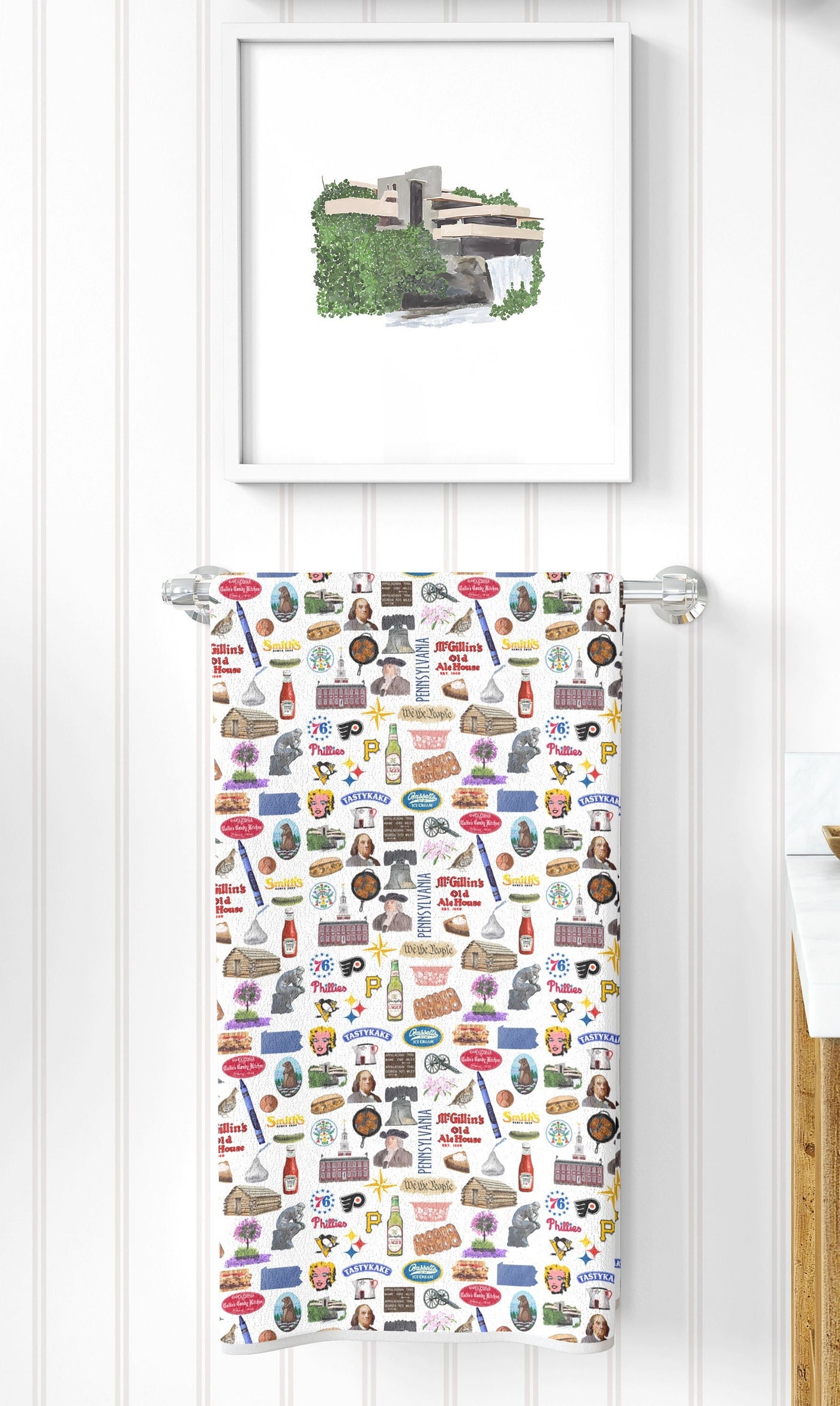 Our towels feature original watercolor art of iconic locales. We offer two sizes to fit your bathroom needs. Hand towels measure 16" x 28" and our bath towels measures a generous 30"x60". The printed side provides a vibrant print, while the reverse cotton side provides for softness and absorbency.