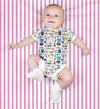 Each bodysuit is made of organic cotton and feature a reinforced snap crotch and a repeat print on the front, back and sleeves. Machine wash cold. Tumble dry light. The pattern placement will vary depending upon the size.